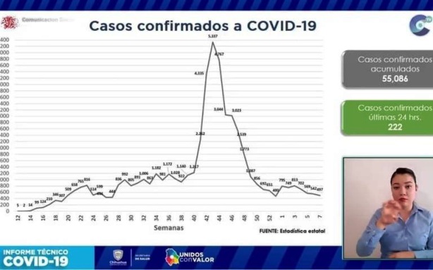 La Secretaría de Salud informó que en las últimas 24 horas se confirmaron 222 contagios por Covid-19, por lo que la cifra acumulada, llegó a los 55 mil 086 casos.