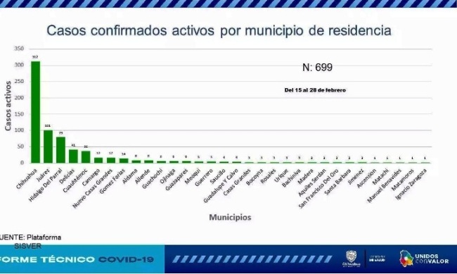 El municipio de Chihuahua nuevamente aparece como el epicentro de los casos activos con 312, que son 29 más (+10%) que la semana pasada.