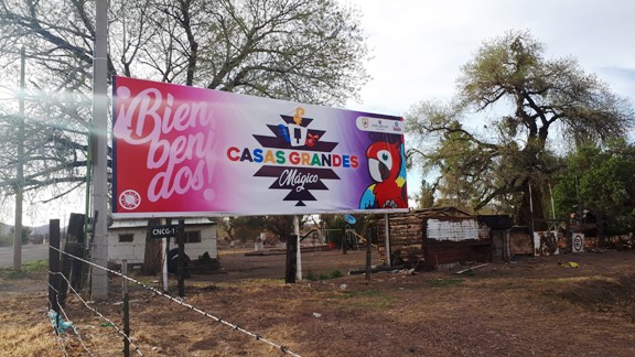 Bienbenidos Casas Grandes, así se podía leer el espectacular que coloco el Comité de Pueblo Mágico de Casas Grandes, a la entrada del municipio para recibir a los visitantes, el diseño esta bonito solo falta corregir el Bienbenidos.