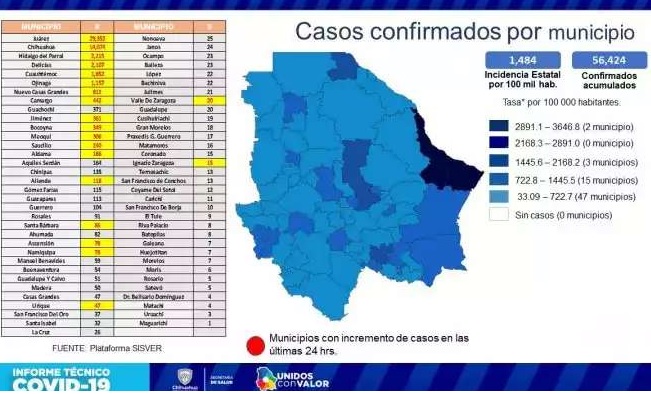 Los municipios con el mayor número de casos confirmados son: Juárez con un acumulado de 29,451, Chihuahua con 14,801, Parral con 2,241, Delicias con 2,138, Nuevo Casas Grandes con 823, Camargo con 449, Guachochi con 380, Meoqui con 314, Aldama con 191, Allende con 123, Gómez Farías con 119, Guazapares con 117, Namiquipa con 79, Guadalupe y Calvo con 51, López con 23 y Ignacio Zaragoza con 16.