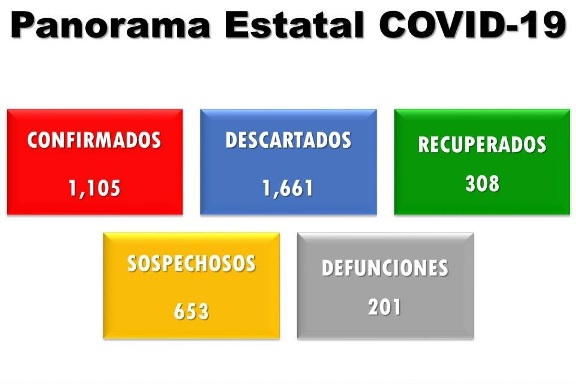 Las autoridades de la Secretaría de Salud informaron son ya mil 105 casos confirmados de COVID-19 en el estado, así como 201 defunciones, 653 sospechosos y 281 personas hospitalizadas, de las cuales 172 están en condición grave.