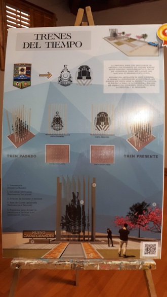 Martin Andrés Ochoa durante su participación agradeció la oportunidad que les dio el municipio de participar en esta convocatoria y dio una explicación del concepto de su obra dijo “Surge dela estructura de los distintos elementos del escudo municipal, tomando como eje rector los ferrocarriles que de alguna manera insisten al espectador a jugar con la estructura, el diseño es un recorrido visual donde el espectador desde la carretera pueda experimentar distintos ángulos de la obra es este el dinamismo de la misma, tiene varios elementos que nos identifica con la región, el señalamiento de la ciudad está basado en un muro de piedras con simbolismo a Paquime por la hermandad con el municipio de Casas Grandes, de igual manera se plantaran árboles frutales como durazno y el encino que darán un contraste de colores, la idea de que en distintas columnas se encuentre la locomotora fue para dar una referencia al bosque”