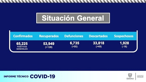 El estado de Chihuahua llegó a 6 mil 735 defunciones y 65 mil 225 contagios de COVID-19 en las últimas 24 horas, informó la Secretaría de Salud en su reporte diario.