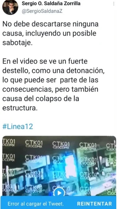 En Twitter, Saldaña Zorrilla borró su mensaje, acompañado de un video, en el que refirió que “no debe descartarse ninguna causa, incluyendo un posible sabotaje”.