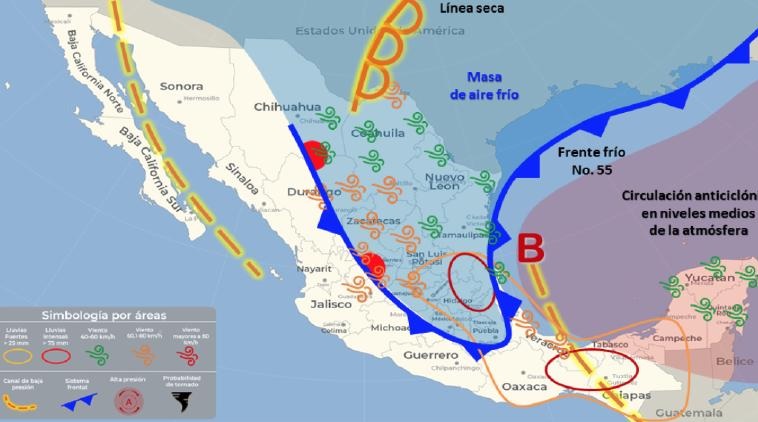 En un comunicado, el Servicio Meteorológico Nacional informó que el frente frío No. 55 se extenderá sobre el oriente del territorio nacional.