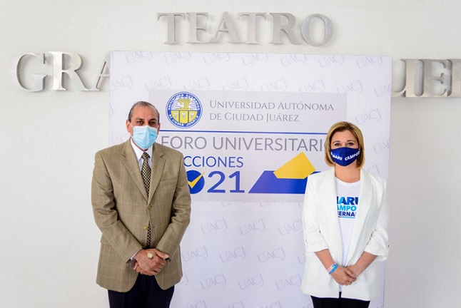Previo al evento en vivo de presentación de propuestas que realizará esta tarde, la candidata de la coalición “Nos Une Chihuahua”, Maru Campos, estuvo presente en el Foro Universitario de Elecciones 2021, organizado por la Universidad Autónoma de ciudad Juárez (UACJ) con el que se pretende integrar a la comunidad universitaria juarense en la vida pública e identifiquen a Maru Campos como la candidata rumbo a la gubernatura del estado de Chihuahua.