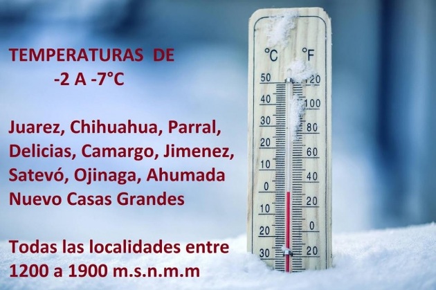 De acuerdo con el instituto se registrarán temperaturas de -2 a -7 grados centígrados en Juárez, Chihuahua, Parral, Delicias, Camargo, Jiménez, Satevó, Ojinaga, Ahumada, Nuevo Casas Grandes.