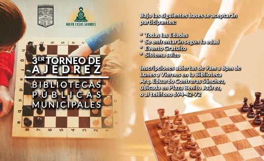 Este próximo 9 de noviembre se estará llevando a cabo la 3era edición del Torneo de Ajedrez, organizado por las bibliotecas municipales que se ubican en la plaza Benito Juárez, colonia Villahermosa y en Sección Hidalgo; las inscripciones en la biblioteca “Eduardo Contreras Sánchez”, aún se encuentran abiertas en un horario de 9:00 de la mañana a 8:00 de la noche o bien comunicándose al teléfono 694 – 42 -72.