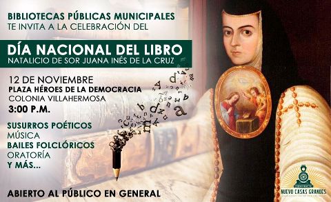 Para conmemorar el Día Nacional del Libro y el Natalicio de Sor Juana Inés de la Cruz, la Presidencia Municipal a través de la Dirección de Deportes, Bibliotecas y Archivo Histórico realizará este martes 12 de noviembre, un evento para fomentar la lectura entre la niñez y la juventud de esta ciudad. El evento se llevará a cabo en las instalaciones de la biblioteca “Francisca Holguín Esquivel” de la colonia Villahermosa.