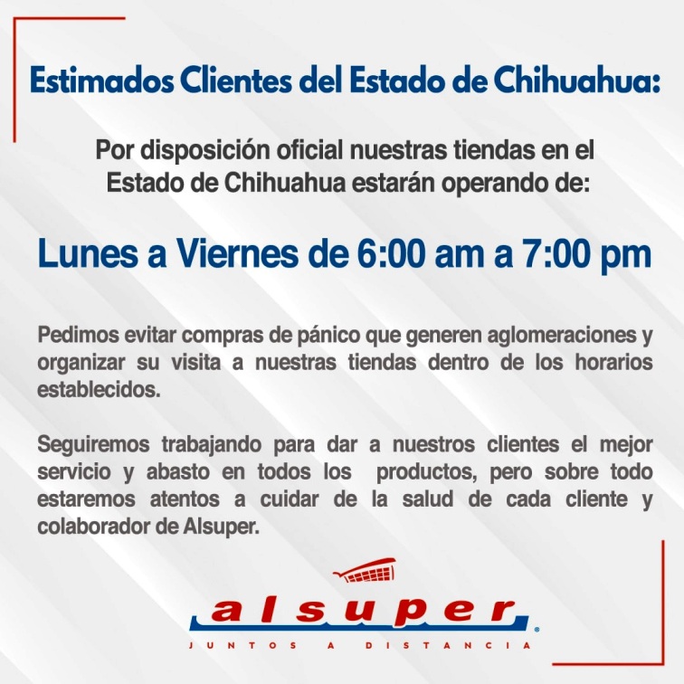 La cadena de tiendas Alsuper informó que en el estado de Chihuahua su nuevo horario será de 6 am a 7 pm de lunes a viernes.