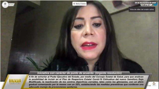 En Sesión de acceso remoto o virtual del Poder Legislativo, fue aprobada la iniciativa de urgente resolución presentada por la diputada del PRI, Anna Elizabeth Chávez Mata, en la cual se solicita al Ejecutivo Estatal, que por medio del Consejo Estatal de Salud, se analice la posibilidad de incluir en el Plan de Reapertura Estatal COVID-19 del nuevo semáforo rojo modificado para la Entidad, la reactivación de centros deportivos cerrados, tales como los gimnasios, con un aforo gradual.
