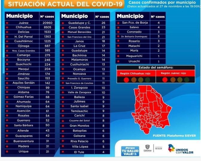 Este sábado 28 de noviembre, la Secretaría de Salud informó que Chihuahua registró 300 nuevos contagios por COVID-19 en el estado la cifra total alcanzó los 37 mil 399 casos, también hubo incremento en los fallecimientos.