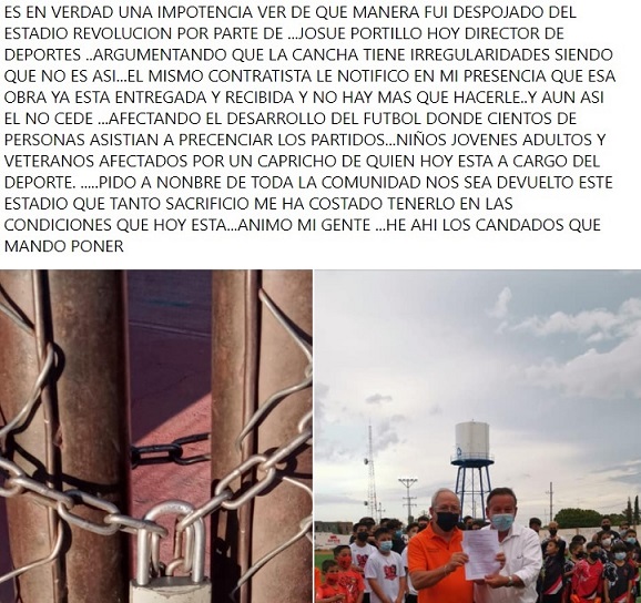 Menciona que fue el director de deportes del municipio Josué Portillo (Tano Portillo) quien realizo esta acción argumentando que la cancha tiene irregularidades. Esta obra la entrego la empresa a la administración pasada como concluida y fue Mariano Galaz quien durante varias administraciones ha estado solicitando apoyos para que este estadio este en mejores condiciones, incluso muchos deportista y gente en general han acudido apoyarlo.