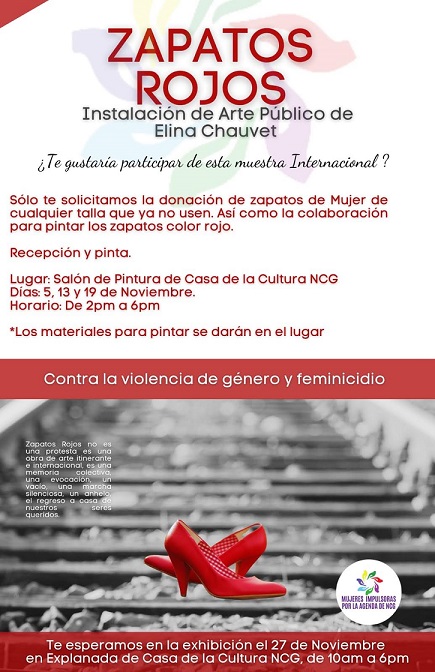 Agenda de Mujeres de Nuevo Casas Grandes da a conocer que la Instalación Internacional de Arte Público "Zapatos Rojos" de la artista Elina Chauvet estará en Nuevo Casas Grandes el próximo 27 de noviembre.
