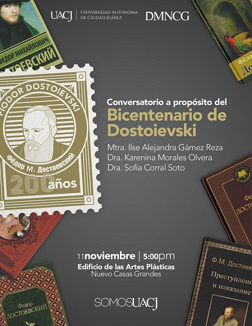 La UACJ extiende una invitación al evento literario "Conversatorio a propósito del Bicentenario de Dostoievski", el cual se llevará a cabo el jueves 11 de noviembre, a las cinco de la tarde en el edificio de Artes Plásticas de Nuevo Casas Grandes, la entrada es gratuita.