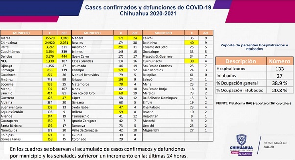 El número de personas que han perdido la vida por esta enfermedad asciende a 8 mil 232 casos, donde las nuevas muertes se concentraron en los municipios de Juárez (+3), Chihuahua (+4), Delicias (+3), Guerrero (+1) y Madera (+1).
