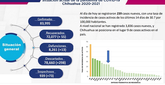 El número de personas que han perdido la vida por COVID-19 se incrementó en la cantidad de 8 mil 261 casos (+13), en los municipios de Juárez (+4), Cuauhtémoc (+4), Guerrero (+1), Allende (+1), Santa Bárbara (+1) y Ascensión (+1), Janos (+1).