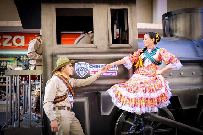 Los participantes recrearon la parte frontal de una locomotora a vapor, icono de la Revolución Mexicana, la cual iba seguida de alumnos del grupo de danza, a cargo del maestro Miguel Conchas, acompañados por el grupo de música del Instituto Tecnológico Nacional, Campus Chihuahua.