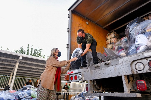 Maru Campos aprovechó para participar en el almacenamiento de las chamarras en el uno de los camiones que harán su entrega, con un espíritu de solidaridad y trabajo en equipo.