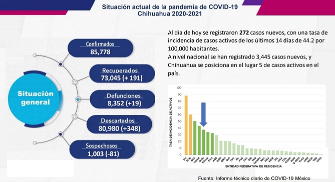 El número de personas que han perdido la vida por COVID-19 ascendió a 8 mil 352 casos (+19) y los nuevos casos corresponden a los muncipios de Juárez (+2), Chihuahua (+10), Parral (+2), Cuauhtémoc (+2), Delicias (+1) y Saucillo (+2).