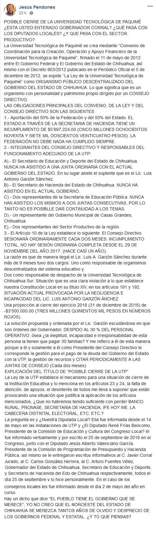 Jesús Pendones publica en su página de Facebook el domingo 14 del mes en curso, el posible cierre de la Universidad Tecnología de Paquime, publicación que causo controversia y temor a algunas personas de la región.