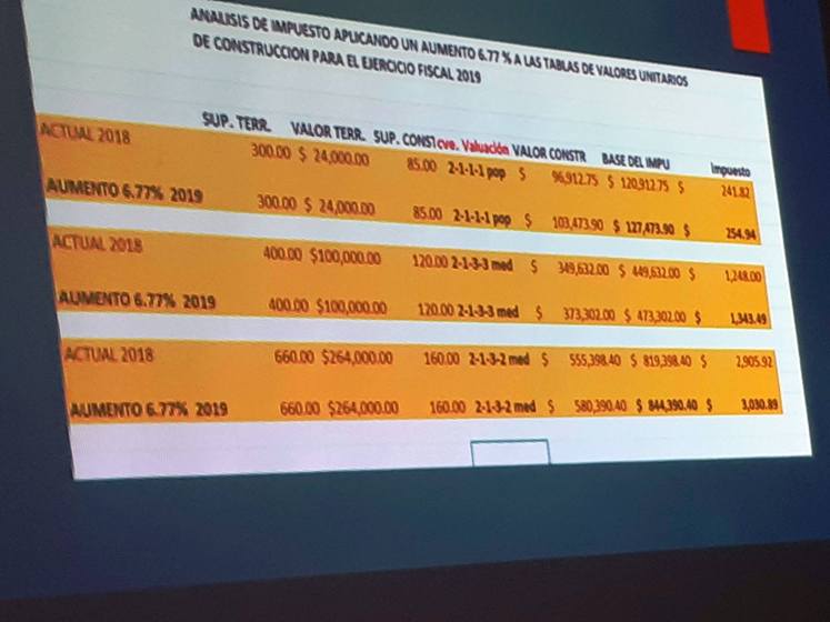 También mencionó que de esta manera el impuesto predial no aumentara, después de la explicación fue presentada una exposición de las tablas catastrales con un ejemplo de cómo aumentaría este impuesto tablas catastrales de construcción, en el caso de una construcción actualmente con un valor de $96,912.75 ya con el aumento quedaría en $103,473.00 el aumento sería de $254.94 al final de la nota se encuentran mas ejemplos.