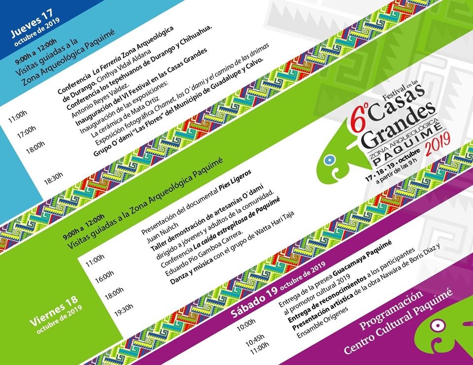 El jueves 17 de octubre arranca el 6to. Festival en las Casas Grandes, en el que se conjugan eventos artísticos, culturales y académicos y que es llevado a cabo por el Instituto Nacional de antropología e Historia de Chihuahua en la zona arqueológica Paquimè, aquí el programa completo.