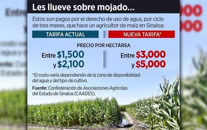 Gustavo Rojo, presidente de la Confederación de Asociaciones Agrícolas del Estado de Sinaloa (CAADES), señaló que los productores de ese Estado pagan actualmente de mil 500 a 2 mil 100 pesos por hectárea por el uso de agua, dependiendo de la zona de disponibilidad de agua y del tipo de cultivo.