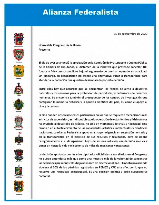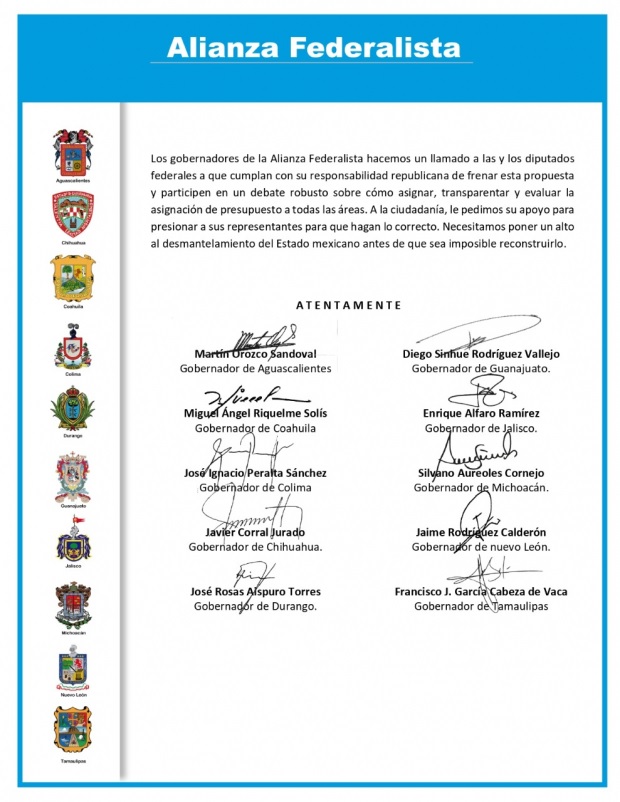 En una misiva, Martín Orozco Sandoval, gobernador de Aguascalientes; Miguel Riquelme de Coahuila; José Ignacio Peralta por Colima; Javier Corral Jurado de Chihuahua; José Rosas Aispuro por Durango; Diego Sinhue Vallejo por Guanajuato; Enrique Alfaro de Jalisco; Silvano Aureoles por Michoacán; Jaime Rodríguez de Nuevo León y Francisco García Cabeza de Vaca por Tamaulipas; aseguraron que “es indiscutible que la operación de estos fondos y fideicomisos ha ayudado al desarrollo de México”; aunque señalaron que en algunos casos se requiere mecanismos más estrictos de supervisión.