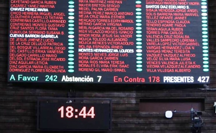 Lorena Villavicencio, Isabel Alfaro, Lidia García, Rocío Barrera, Wendy Briceño, diputadas de Morena, votaron en contra y en abstención Tatiana Clouthier, Marivel Solís y Guadalupe Castañeda.