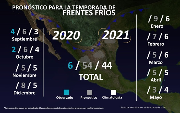 De acuerdo a la CEPC con datos del Servicio Meteorológico Nacional (SMN), con el ingreso del frente frío a partir de este 15 de octubre, asociado a una masa de aire frío, en interacción, un canal de baja presión y una corriente en chorro, favorecerá además cielo de parcial a mayormente nublado.