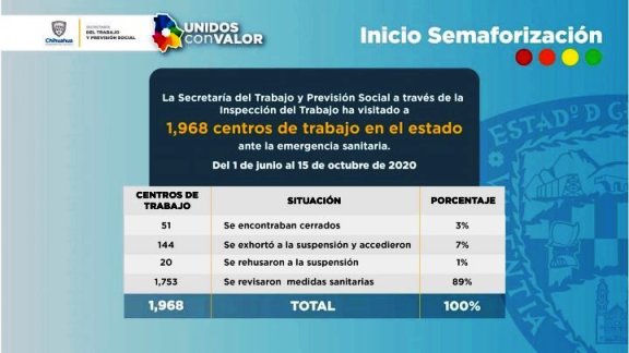 Durante el programa Chihuahua Adelante, Marco Antonio Gaytán González, jefe de Inspección del Trabajo de la STPS, indicó que la dependencia estatal ha verificado mil 968 establecimientos desde el pasado 1 de junio, con la implementación del esquema de semaforización.