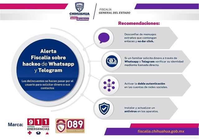 La Fiscalía General del Estado (FGE) emitió una alerta a la ciudadanía, sobre el hackeo de cuentas de aplicaciones digitales como Whatsapp y Telegram, que realizan delincuentes para obtener información de los contactos y solicitarles dinero.