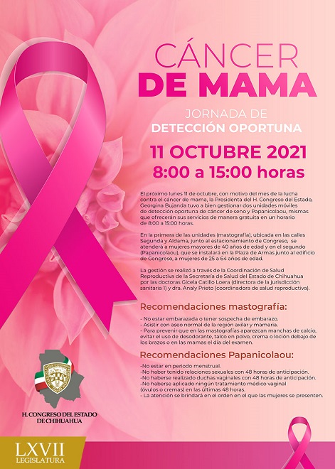 En el marco de la conmemoración de Octubre, mes de la sensibilización de la lucha contra el cáncer de mama, la presidenta del Congreso del Estado, Geo Bujanda invita el lunes 11 de octubre a la “Jornada de detección oportuna de cáncer de mama y cervicouterino” que tendrá lugar en las inmediaciones de la Plaza de Armas, de 8 de la mañana a 3 de la tarde.