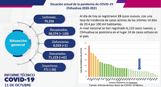 Los 19 nuevos casos de COVID-19 se concentran en los municipios de Chihuahua el cual suma 24 mil 459 casos, Parral 3 mil 541 casos, Cuauhtémoc 3 mil 253, Delicias 2 mil 822, Guachochi 748, Bocoyna 696, Meoqui 580, Guazapares 208, Belisario Domínguez 13 y Uruachi 10.