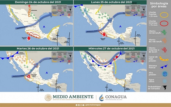 Para el lunes 25 de octubre, el nuevo sistema frontal sobre la zona noroeste del país, en interacción con la corriente en chorro y un canal de baja presión favorecerá ambiente de fresco a templado por la mañana y caluroso por la tarde, y temperaturas frías por la mañana en la zona serrana.