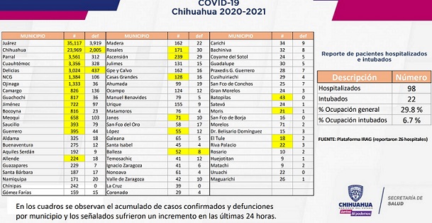 El número de personas que han perdido la vida por COVID-19, asciende a 8 mil 112 casos (+4) y se concentró en los municipios de Chihuahua (+2), Delicias (+1) Balleza (+1).