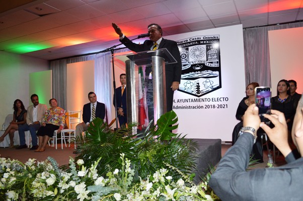 Héctor Mario Galaz Griego, Cynthia Ceballos rindieron protesta simbólicamente como Presiente y Síndico Municipal de Nuevo Casas Grandes por el periodo 2018-2021, de igual manera el alcalde Héctor Mario tomo protesta a los regidores de los diferentes partidos políticos.