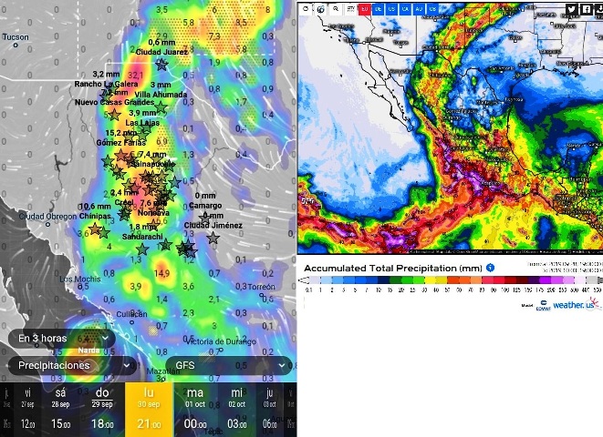Para el día de hoy se prevén Lluvias muy fuertes a puntuales intensas (75 a 150 litros por metro cuadrado en zonas del Estado de Chihuahua, las tormentas se acompañarán de Descargas eléctricas y Viento de hasta 50 km/h. Y posibilidad de granizo.