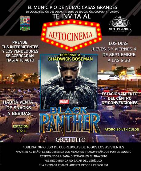 Este 3 de septiembre y 4 de septiembre las familias podrán disfrutar de la película de acción “Black Panther” a partir de las 8:30 de la noche. El aforo quedará limitado para 80 vehículos acomodados en el estacionamiento del Centro de Convenciones y el acceso será a partir de las 7:30 de la noche.