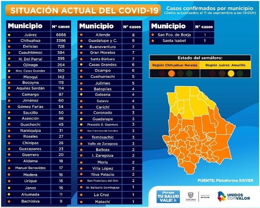 La Secretaría de Salud informó que a las 7:00 horas del 12 de septiembre, se tienen en el estado de Chihuahua un total general de 13 mil 238 casos de COVID-19; se confirmaron 99 contagios más, así como seis nuevas defunciones para sumar mil 267.
