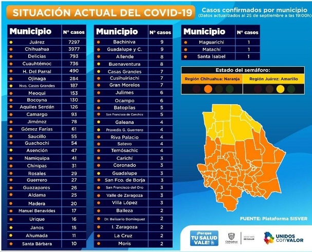 Salud del Estado informó que los municipios que tuvieron nuevos casos confirmados de covid-19 son: Juárez, Chihuahua, Delicias, Cuauhtémoc, Parral, Ojinaga, Nuevo Casas Grandes, Meoqui, Bocoyna, Aquiles Serdán, Camargo, Saucillo, Guachochi, Namiquipa, Guazapares, Aldama, MAdera y San Francisco de Conchos.