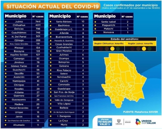Los municipios de la región Chihuahua que cambian al amarillo son: Bachíniva, Chínipas, Gómez Farías, Madera, Morelos, Riva Palacio, Uruachi, Chihuahua, Gran Morelos, Nonoava, Bocoyna, Cuauhtémoc, Guazapares, Maguarichi, Moris, Temósachic, Aldama, Coyame del Sotol, Manuel Benavides, Ojinaga, Carichí, Cusihuiriachi, Guerrero, Matachí, Ocampo, Urique, Aquiles Serdán, Dr. Belisario Domínguez, Namiquipa, Julimes, Rosales, Satevó, La Cruz, San Fco. de Conchos, Batopilas, Guachochi, Huejotitán, López, San Fco. del Oro, San Fco. de Borja, Delicias, Meoqui, Allende, Coronado, Guadalupe y Calvo, Ignacio Zaragoza, Matamoros, Santa Bárbara, Santa Isabel, Camargo, Saucillo, Balleza, El Tule, Parral, Jiménez, Rosario y Valle de Zaragoza.