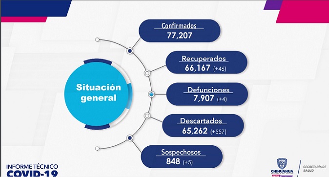 También se ratificó el incremento en el número de defunciones quedando en 7 mil 907; en recuperados suman 66 mil 167 (+46) recuperados, descartados son 65 mil 262 (+557) y contabiliza en 848 (+5) los casos sospechosos.